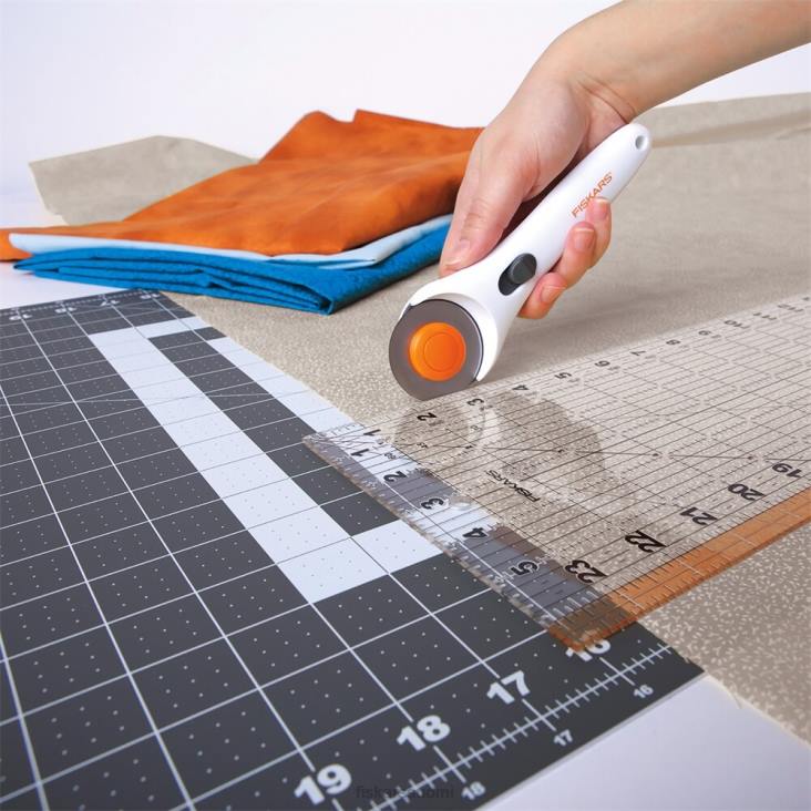 - klassinen sauvassa pyörivässä leikkurissa on rullaava 45 mm:n terä, joka leikkaa useita kerroksia ja pitää kankaan tasaisena tarkan ja suoran leikkauksen aikaansaamiseksi ilman rosoisia reunoja.