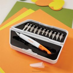 Helppo vaihdettavissa oleva veitsisarja, joka on suunniteltu haluamaasi työtapaa varten, tekee vaihtamisesta eri leikkaustehtävien välillä helppoa. Loistava valinta paperin, kartongin, ohuen muovin, valokuvien, kankaiden ja muiden leikkaamiseen, veitsessä on helppo teränvaihtolukko, jonka avulla voit vaihtaa teriä sekunneissa. Pysy mukavasti hallinnassa isoissa ja pienissä projekteissa ergonomisesti muotoillun kahvan, jossa on softgrip-kosketuspisteet. lisäksi rullaamaton muotoilu ja mukana tuleva teräsuojus lisäävät turvallisuutta. Sarjassa on neljä erilaista terätyyliä ja yhteensä 12 terää, mikä varmistaa, että käytät aina materiaaleihisi ja projektiisi sopivaa terää.