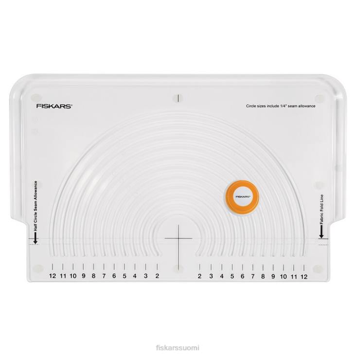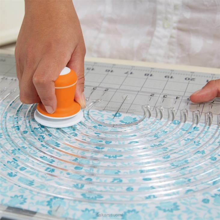 kangasympyräleikkuri auttaa leikkaamaan puhtaita, yhtenäisiä ympyröitä ja kehyksiä ilman jälkiä tai huojuvaa vapaalla kädellä leikkaamista. kätevä työntöleikkuri liukuu sujuvasti mallin uria pitkin halkaisijaltaan 2″ – 12″ ympyröille. sen pyörivän kahvan avulla voit tehdä koko leikkauksen ilman vääntymistä tai kurkotusta, kun taas pehmeä softgrip lisää mukavuutta. sisäänrakennettu 1/4″ ympyräsaumanvara ja valinnainen 1/4″ puoliympyrän saumanvara lisäävät käyttömukavuutta. Ympyrän leikkaamiseksi taita kangas vain kahtia ja aseta malli päälle ja kohdista mallin alahuuli taitetun reunan kanssa. sijoita leikkuri johonkin 11 urasta, paina alas paljastaaksesi terän ja aja sitä pitkin uraa, jotta saat moitteettoman ympyrän ilman karkeita reunoja, kolhuja tai reikiä.