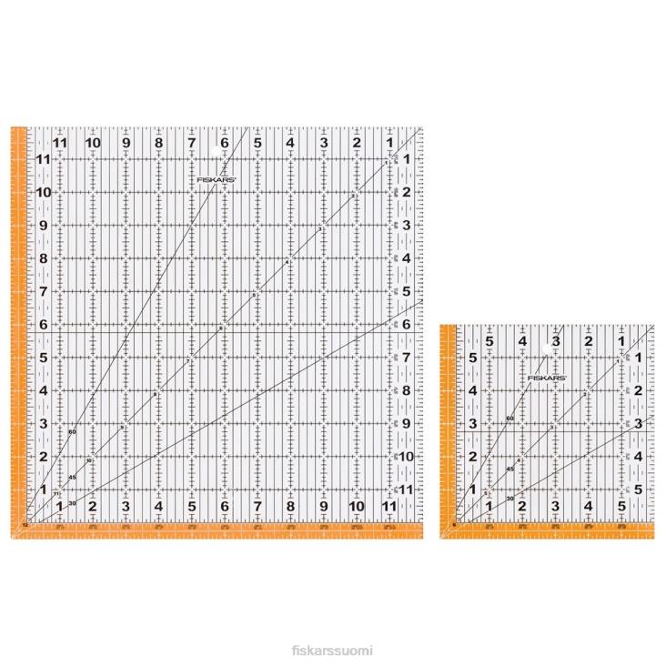 Tämä neliönmuotoinen akryyliviivainsarja on suunniteltu erityisesti tikkareita varten, ja se sisältää yhden suuren nelikulmaisen viivoittimen ja yhden keskikokoisen viivaimen, joka täyttää kaikki lohkoleikkaustarpeesi. molemmissa viivoissa on korostettu saumanvara ja helppolukuiset ruudukkoviivat, jotka tekevät täydellisen kankaan neliöiden leikkaamisesta helpompaa kuin koskaan ennen. se sisältää 30-, 45- ja 60-asteen viivaosoittimet.