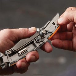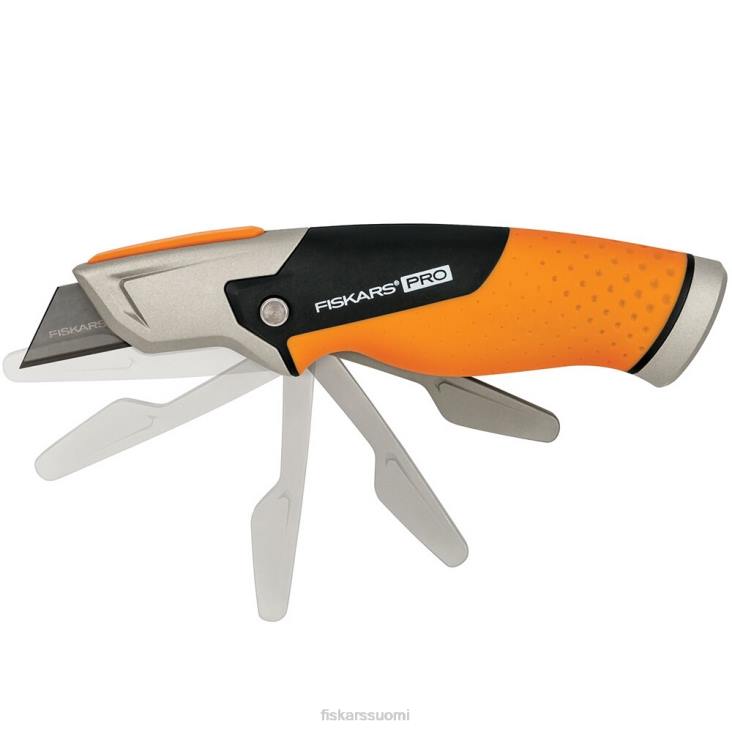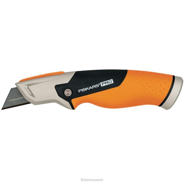 - Fiskars pro -kiinteän veitsen taittuva teräsuojus laukeaa napin painalluksella ja tarjoaa kätevän ja helpon suojan