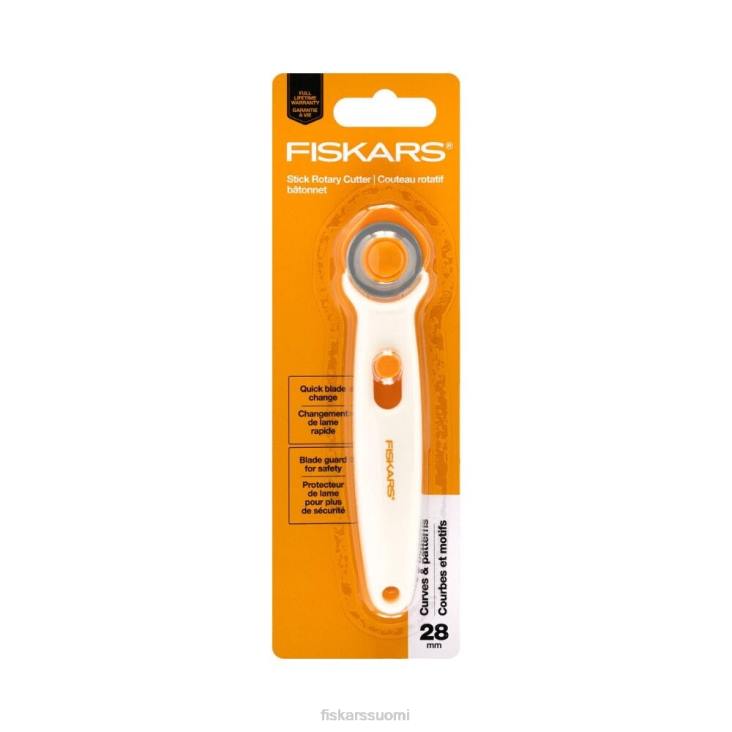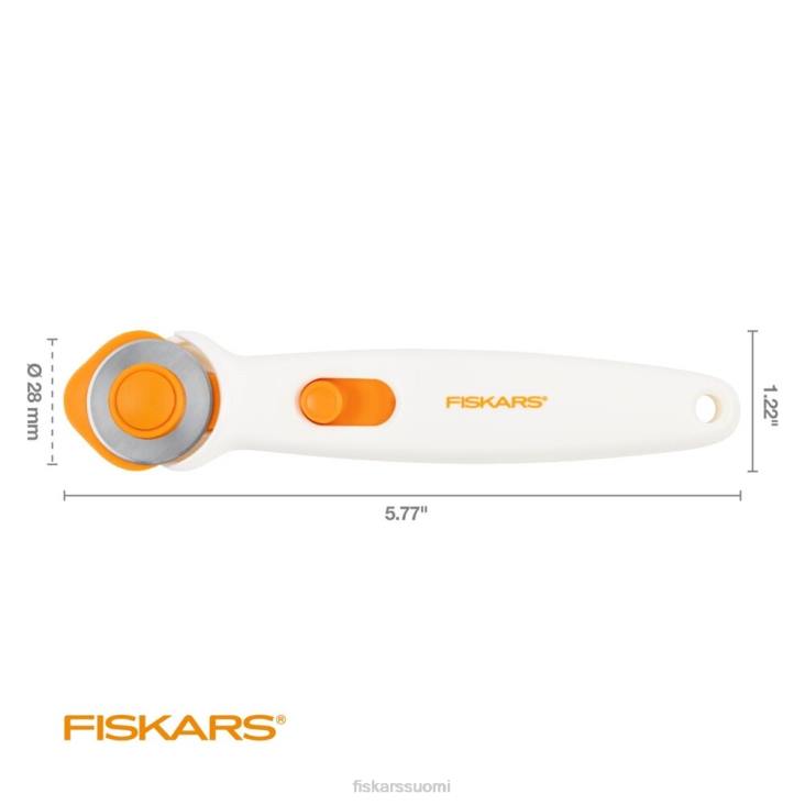 - Fiskarsin pyörivä leikkuri (28 mm) on ihanteellinen monimutkaisten kaarevien, kuvioiden ja kuvioiden leikkaamiseen. applikaatio yksittäisissä kangaskerroksissa