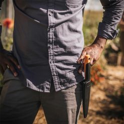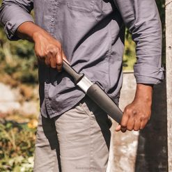 - kaksiteräisessä veitsessä on ruostumaton teräs, tarkkuushiottu reuna monikäyttöisiä leikkauksia varten sekä hammastettu reuna paksun kasvuston läpi sahaamiseen
