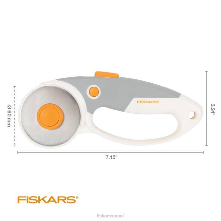 - Fiskarsin titaanisilmukkainen pyörivä leikkuri (60 mm) on ihanteellinen leikkauskoneisiinvanu ja useita kerroksia paksua kangasta, kuten kangasta, denimiä ja nahkaa